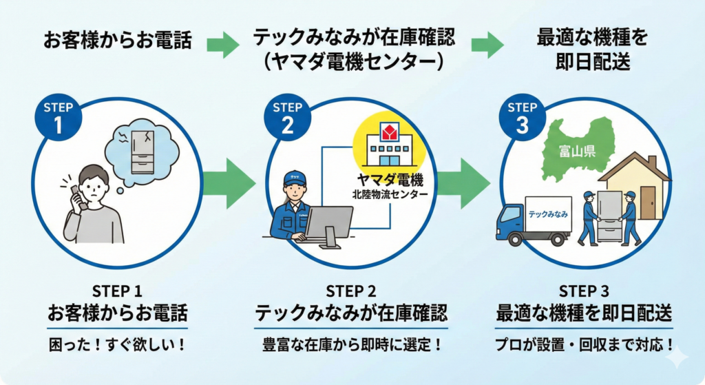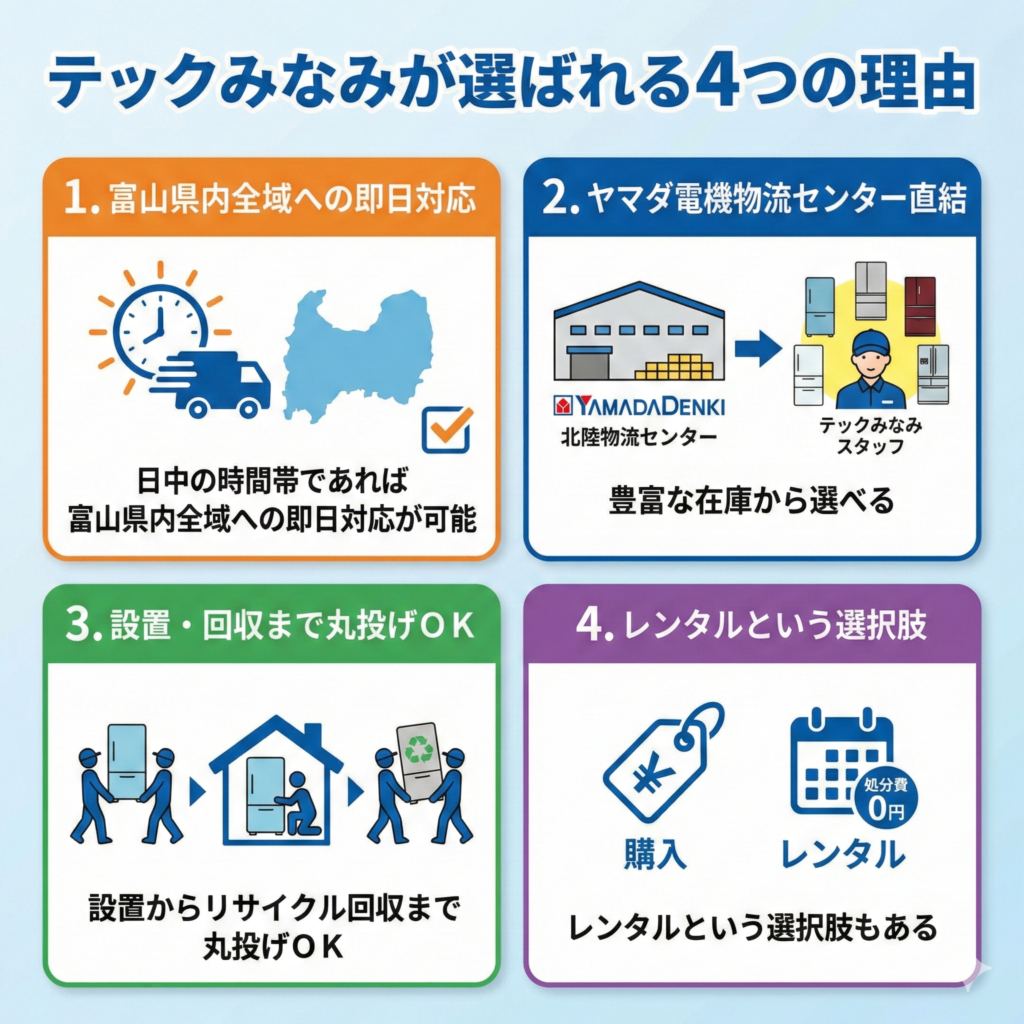 一般的な店舗では配送ルートが固定されていますが、テックみなみは富山市を拠点とした地域密着の機動力があります。日中の時間帯であれば、富山市内はもちろん、富山県内全域(※)への即日配送・設置が可能です。