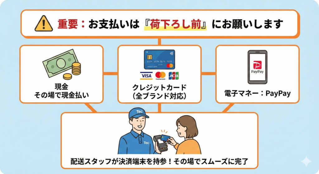 配送スタッフが決済端末を持参しますので、その場でスムーズに完了します。