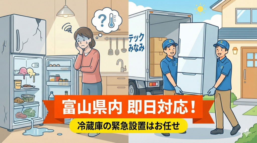 家電量販店へ行っても「配送は数日後」「設置は来週」と言われて絶望した経験はありませんか?富山県内で今すぐ冷蔵庫が必要な方へ、私たちテックみなみがそのピンチを即座に解決いたします。